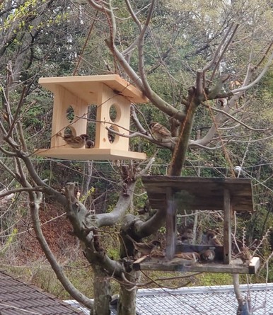新しいえさ台(左上)を設置して半月ほど経ちました。少し慣れてきて、新しい方にもチラホラとまり、えさをついばむようになりましたが・・・まだまだかな?