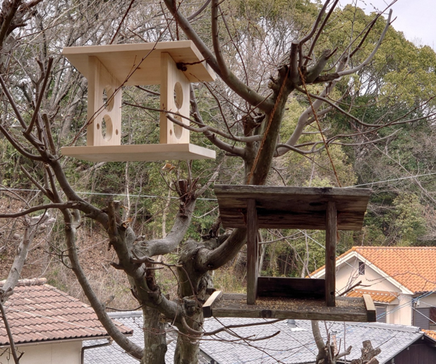 えさ台(写真右下)が古くなったので、新しいえさ台(写真左上)をつくったのは良いが、小鳥が寄り付いてくれない。小鳥と言ってもほぼほぼスズメなのだが、古い方のえさをつついても新しいほうには見向きもしない・・・。数年前につくった古い方は、雨風にうたれたせいで 自然の樹の風合いと一体化しているが、新しいえさ台は、製材仕立ての色、小鳥に警戒心を与えているようだ。そういえば古い方を作ったとき、結構な期間、鳥は近寄らなかったなぁ。